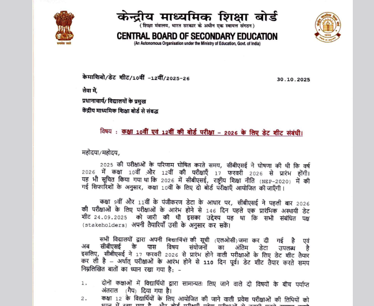 CBSE बोर्ड ने मंगलवार को जारी किया एक official नोटिस जिसमे सीबीएसई ने जानकारी दी कि कक्षा 10 और 12 के प्रैक्टिकल एग्ज़ाम, प्रोजेक्ट मूल्यांकन और आंतरिक मूल्यांकन प्रदेश के सभी स्कूलों में 1 जनवरी से 14 फरवरी 2026 के बीच आयोजित किए जाएंगे।