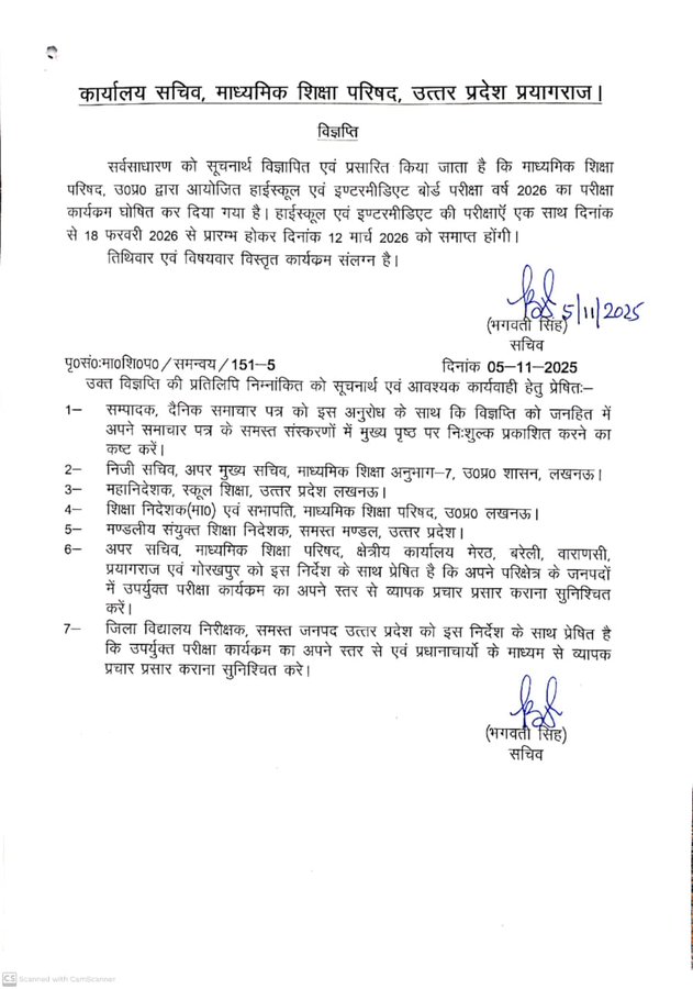 हाई स्कूल और इण्टर के exam की डेटशीट 05/11/2025 को जारी की गई है और यह सूचना प्रदेश के लगभग हर कॉलेज तक पहुंच चुकी है | हाई स्कूल और इण्टर की परीक्षा की तिथि 18 फरवारी 2026 निर्धारित की गई हैं |